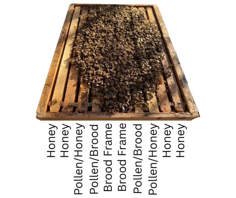 Feeding: Adding a mix that is 2parts sugar, 1 part water (2:1 simple syrup) to your hive will allow the bees to fill any empty comb and have adequate stores to get through our long winter! For an average 20 frame hive (2 deep boxes), you want the top box to weigh at least 70lbs. The bottom box will be where they start out their cluster to keep the Queen and brood chambers warm and fed. The bottom box will have pollen and honey and the brood frames. **See the Bottom Deep Fall Cluster Image.